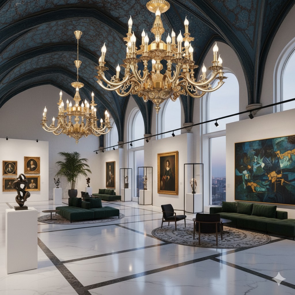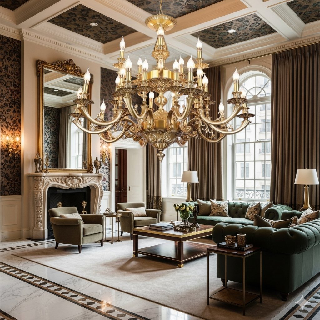 Chất liệu đồng nguyên khối mang đến độ bền vượt thời gian. Ánh sáng vàng ấm tạo cảm giác ấm cúng cho bữa ăn, đồng thời tôn lên vẻ uy nghi của phòng khách và đại sảnh. Đây là điểm nhấn nghệ thuật giúp khẳng định phong cách sống thượng lưu của gia chủ.