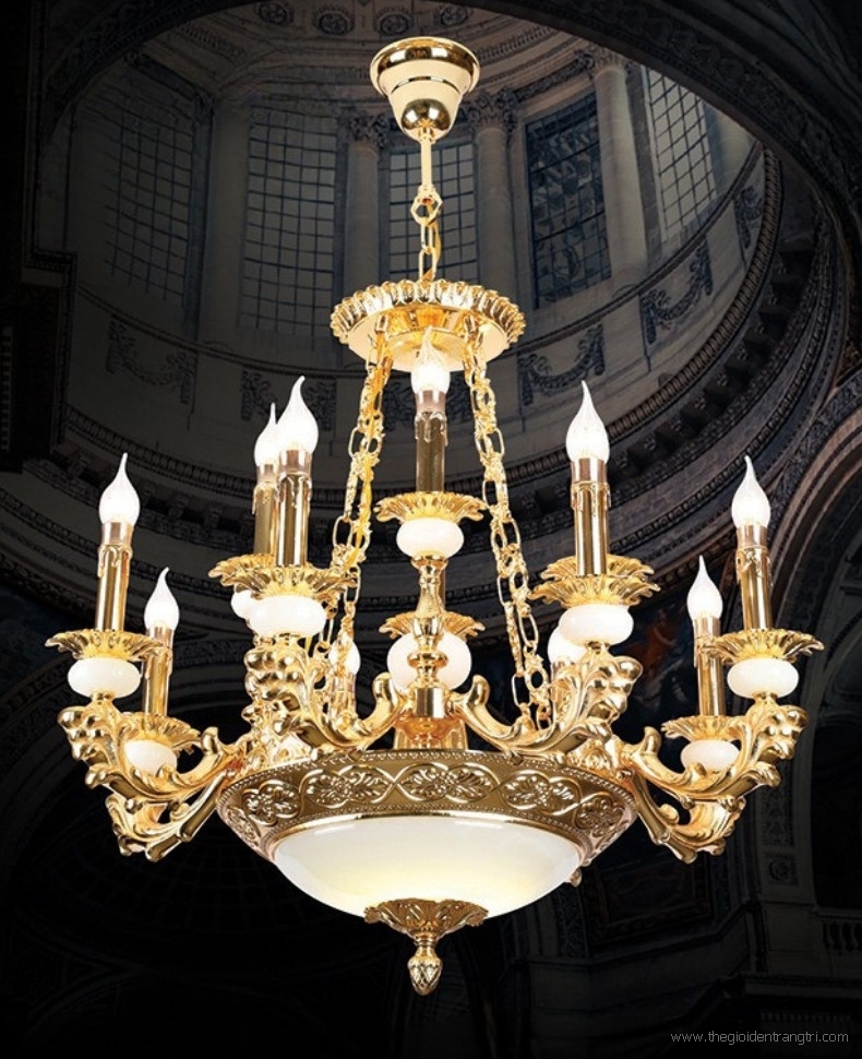Đèn Chùm Nến Đồng Xi Vàng Chao Đá Bạch Ngọc CD333-42 Φ1070