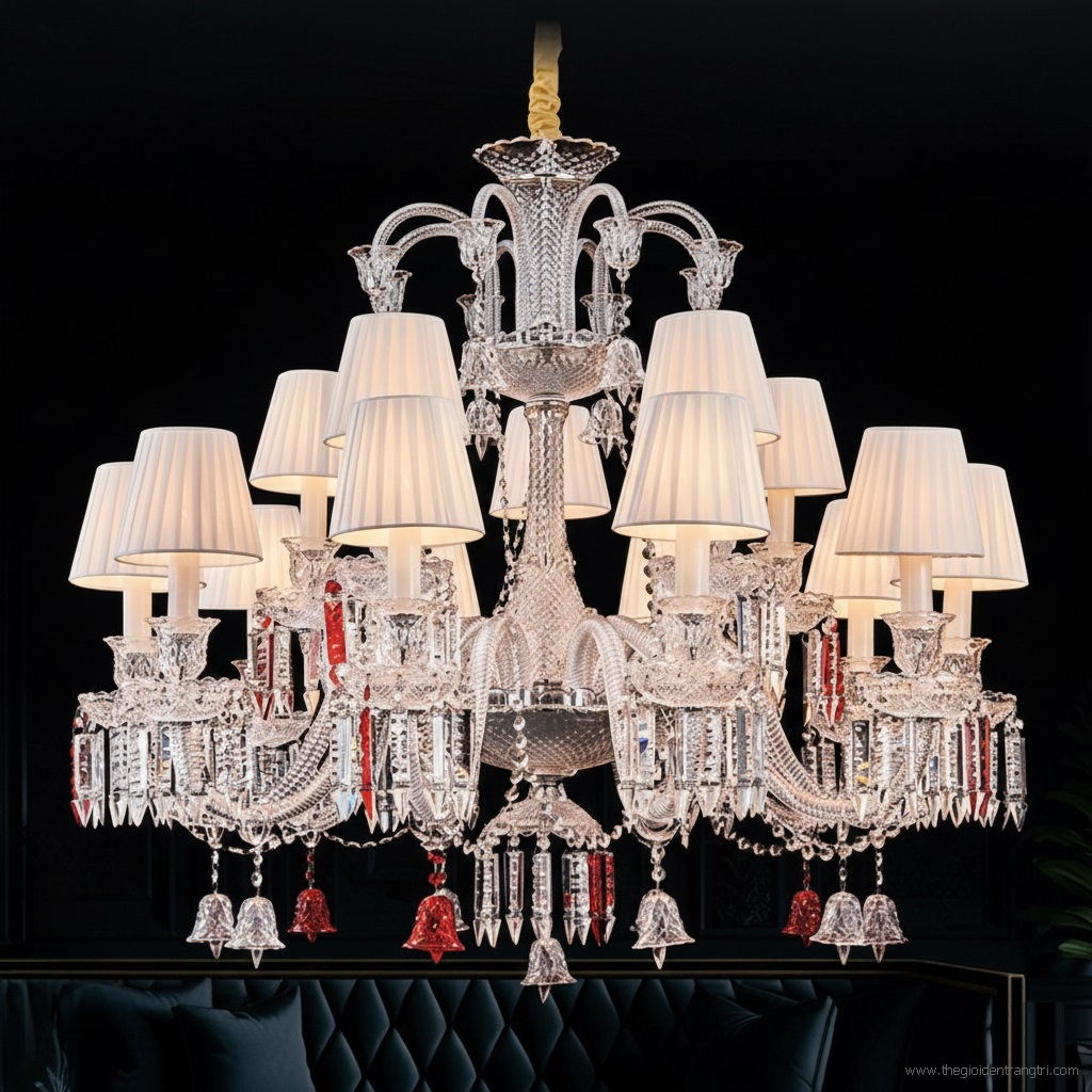 - Thân đèn bằng thủy tinh đúc, kết hợp pha lê K9 trong suốt và chuông đỏ nổi bật.