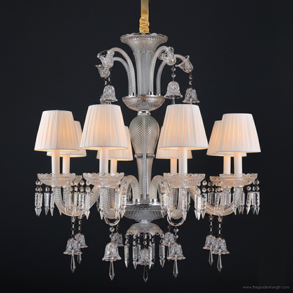 - Thân đèn bằng thủy tinh đúc, kết hợp pha lê K9 trong suốt và chuông nhỏ nổi bật.