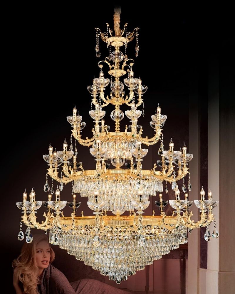 - Đèn chùm nến pha lê đồng thiết kế kiểu 4 tầng với tay đèn nghệ thuật.