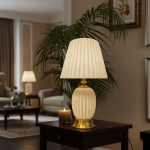 | Mô tả | Thiết kế: Đèn để bàn trang trí phong cách hiện đại Kích thước: W250 x H450 Bóng đèn: E27 x 1 (đèn chưa bao gồm bóng) Đặc điểm: - Thân đèn bằng sứ màu kem, tạo hình thanh thoát và sang trọng. - Chụp đèn bằng vải trắng cao cấp, chân đế và trụ bằng đồng vàng. Ứng dụng: Trang trí bàn sofa phòng khách, tab đầu giường, bàn làm việc, bàn trang điểm, quầy lễ tân, không gian sảnh chờ hoặc phòng đọc sách. |