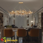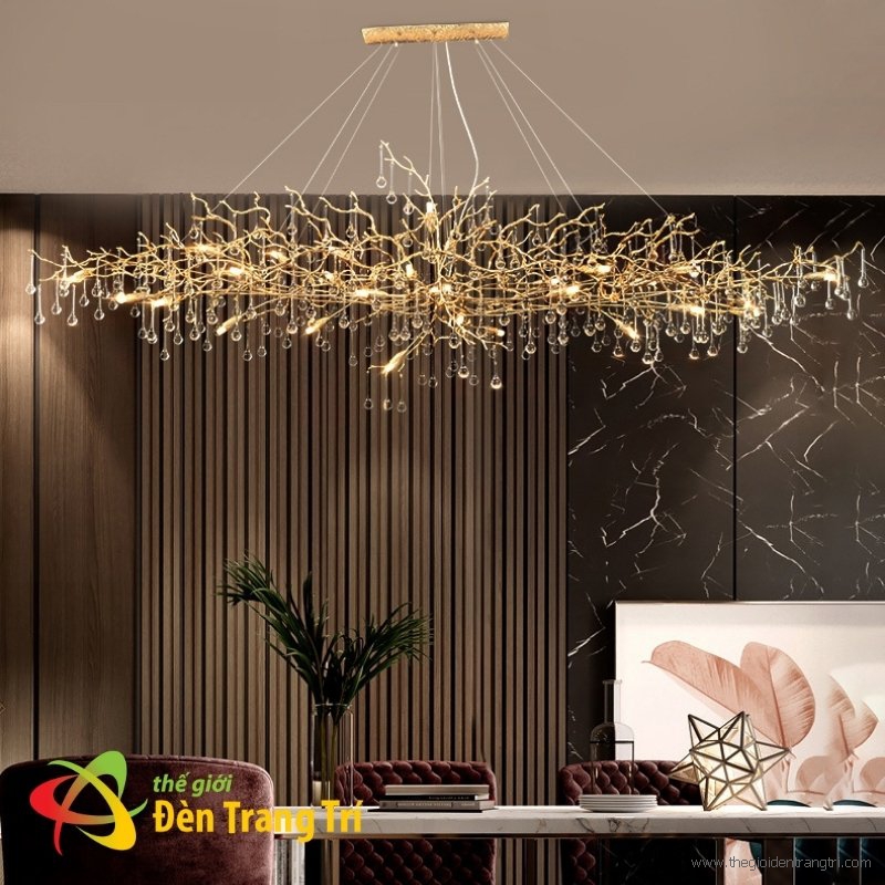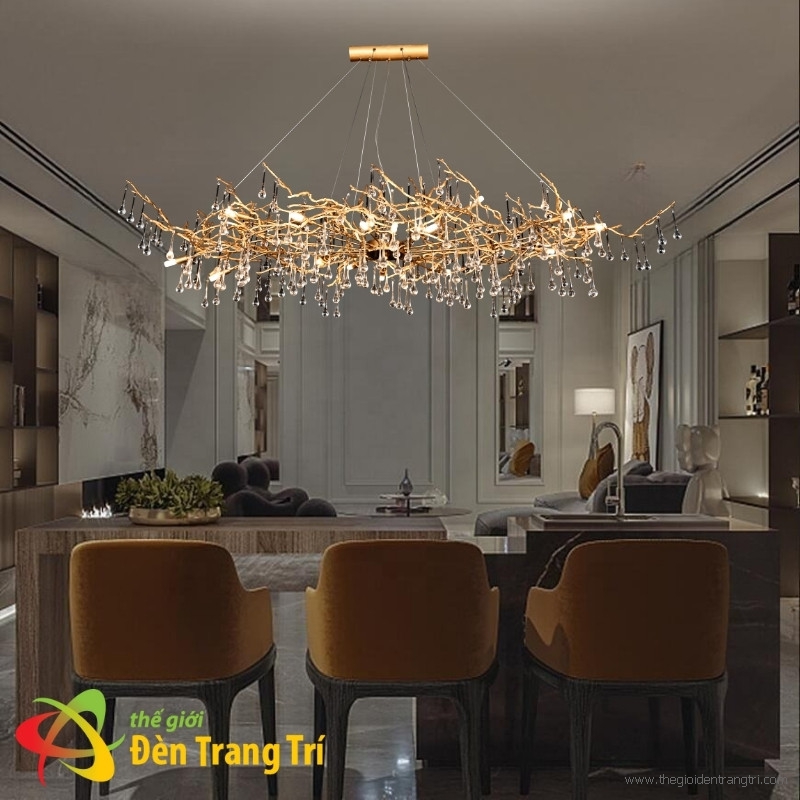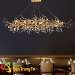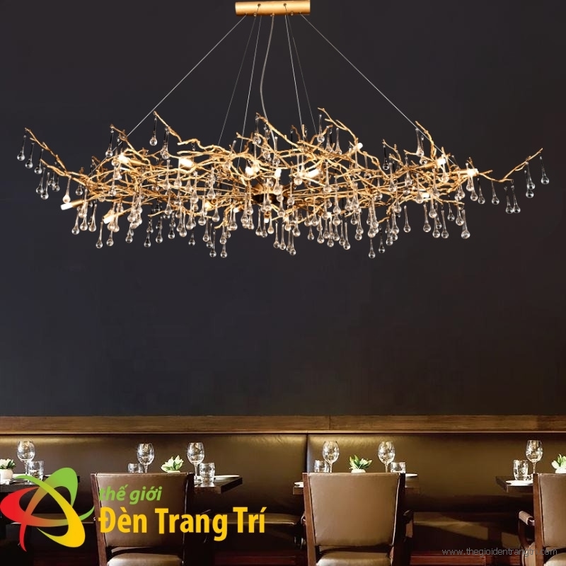 Kiểu dáng lấy cảm hứng nhánh cây vàng óng, pha lê K9 lấp lánh tạo hiệu ứng ánh sáng sang trọng cho không gian ẩm thực.
