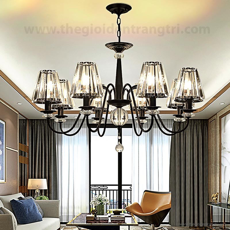 Đèn chùm pha lê hiện đại 8 tay THCN296 (Kích thước: Ø800 x H800): Với kích thước lớn và thiết kế đẳng cấp, đèn chùm này tạo điểm nhấn lôi cuốn cho không gian phòng khách của bạn.
