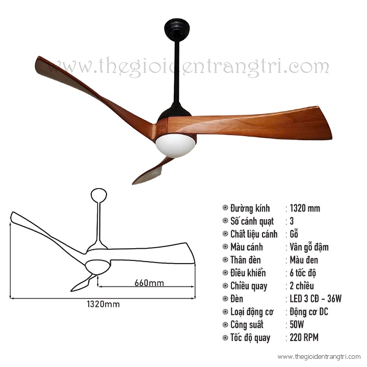 Quạt Đèn Trần Cánh Gỗ Hiện Đại KH-QT52 Ø1320