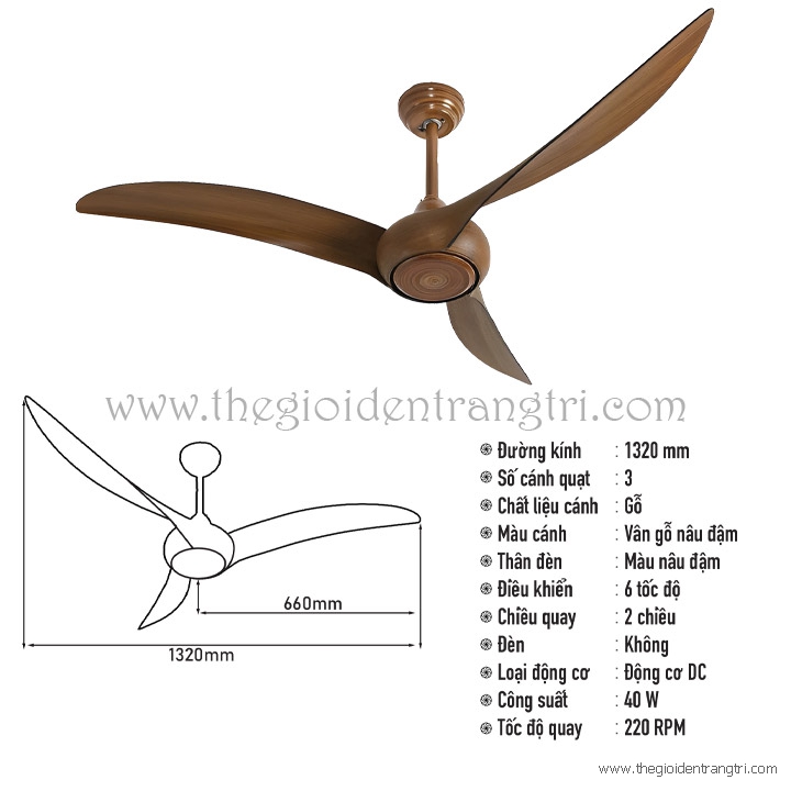 Quạt Trần Cánh Gỗ Không Đèn KH-QT62 Ø1320