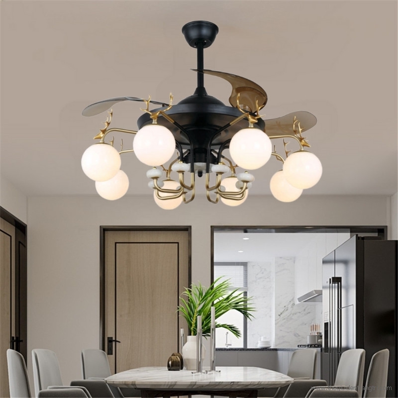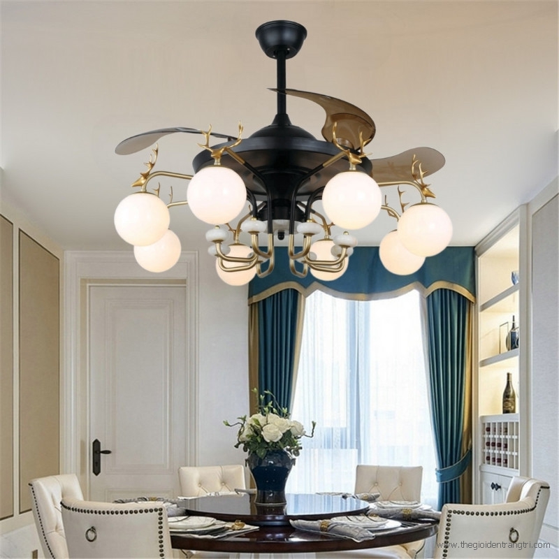 DQ6129 mang phong cách thiết kế tân cổ điển với tay đèn chùm được cách điệu đầu hươu mạ vàng độc đáo, thân quạt sơn tĩnh điện màu đen sang trọng và cánh xếp hiện đại bằng nhựa ABS trong suốt.